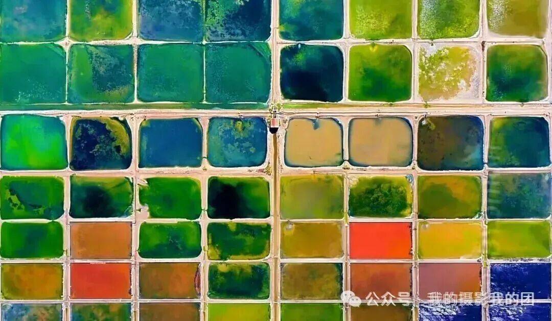 平坦的大地上,规整的盐池组成了一个超过1500亩的巨型“调色板”,当阳光洒在这些盐池上,每个格子因盐水浓度不同而呈现出不同色彩,宛如平铺在大地上的彩妆盘闪闪发亮。