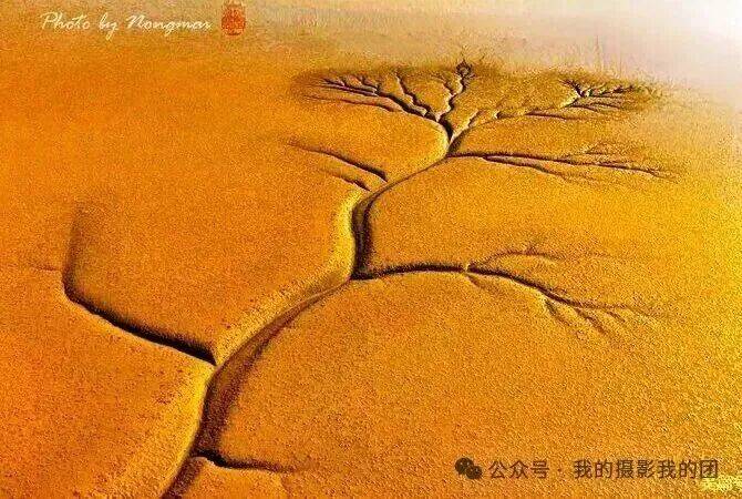 东营黄河入海口,因大量泥沙沉积,形成广阔的湿地。河流弯弯曲曲流入渤海,在潮汐的作用下,黄河口湿地容易出现奇特的“潮汐树”。蓝色的海水沿着潮汐沟,深入黄色的泥沙中间,像一条条蜿蜒伸向远方的小路,近大远小,进而构成“潮汐树林”。